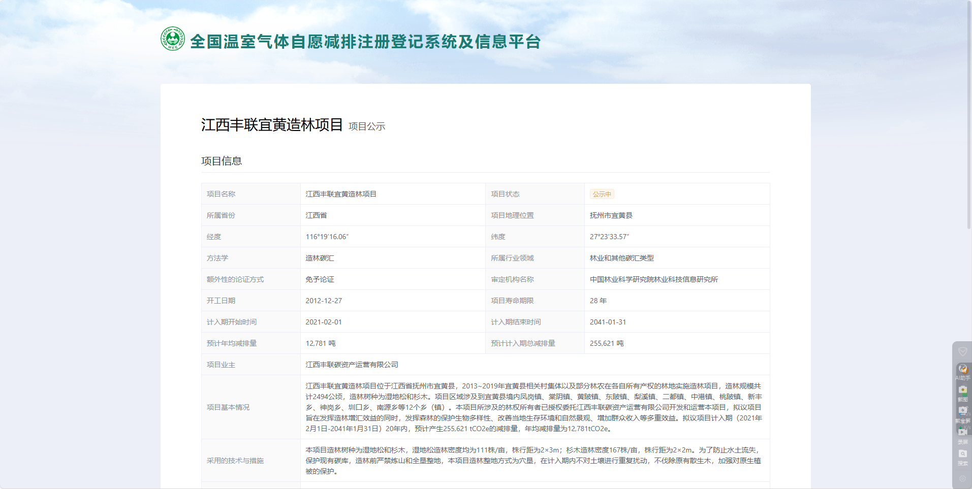 12月27日,由撫州市農發(fā)集團開發(fā)的宜黃縣林業(yè)碳匯項目成功列入CCER造林碳匯項目公示名單。